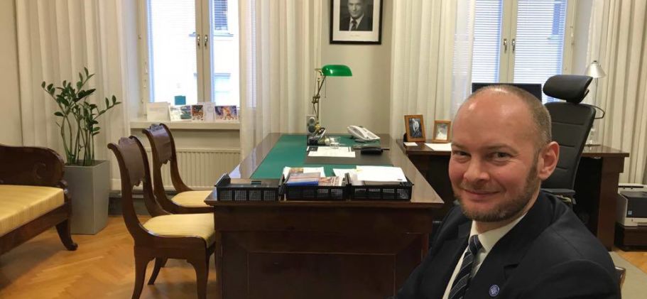 Sampo Terho (sin.) tapasi MustReadin työhuoneessaan kulttuuriministeriössä. Kuva: MustRead