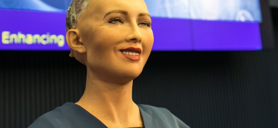 Robotisaatio voi nostaa työn tuottavuutta merkittävästi, mutta ammattirakenteen pitää samalla muuttua. Kuvassa humanoidirobotti Sophia esiintymässä tekoälykonferenssissa. Kuva: International Telecommunication Union